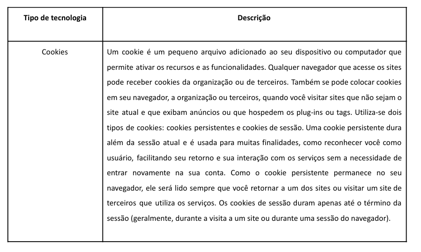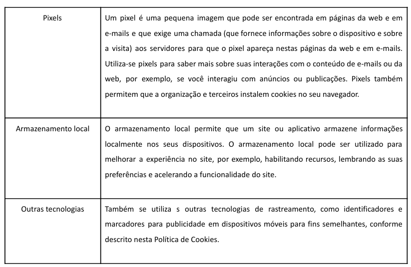 relacionados ou incorporados pela própria Política à organização. Utiliza-se cookies e tecnologias
