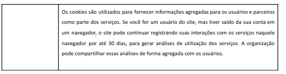 As tabelas de cookies listam alguns dos cookies usados pela organização e por terceiros como parte dos Serviços. Observe que essas tabelas podem ser atualizadas de tempos em tempos para fornecer a você as informações mais recentes.